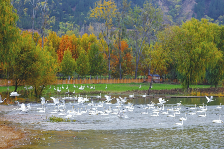 運(yùn)城的冬天,吸引了大天鵝、火烈鳥、反嘴鷸、蒼鷺、棕頭鷗、灰鶴、黑翅長(zhǎng)腳鷸等近200種野生鳥類。當(dāng)成群的大天鵝從遙遠(yuǎn)的西伯利亞飛抵運(yùn)城,在運(yùn)城鹽湖景區(qū)、平陸大天鵝景區(qū)、芮城圣天湖景區(qū),均呈現(xiàn)出“萬頃河水碧、一池雪花白”的壯觀景象,三大天鵝觀賞景區(qū)同步開放。成千上萬只白天鵝在黃河岸畔或自在游弋,或追逐戲水,或引吭高歌,為冬日的黃河流域運(yùn)城段增添了悠然靈動(dòng),讓人在此如臨仙境,流連忘返。為方便廣大游客參觀游覽,運(yùn)城免費(fèi)開放冬觀天鵝專線城景通,期間周六開設(shè)平陸專線,途經(jīng)鹽湖景區(qū)、周倉(cāng)文化園、平陸大天鵝景區(qū)等,周日開設(shè)芮城專線,途經(jīng)鹽湖景區(qū)、圣天湖、永樂宮、廣仁王廟、城隍廟等,法定節(jié)假日兩條線同時(shí)運(yùn)行,可在運(yùn)城高鐵站、北郊億適家超市、運(yùn)城火車站等市區(qū)公交站點(diǎn)乘坐。