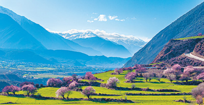 盛開(kāi)的桃花與遠(yuǎn)處的雪山相映成景。