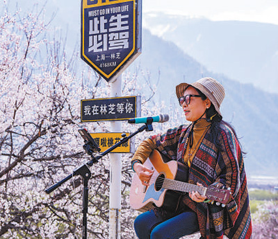 游客在桃花節(jié)現(xiàn)場(chǎng)即興彈唱。