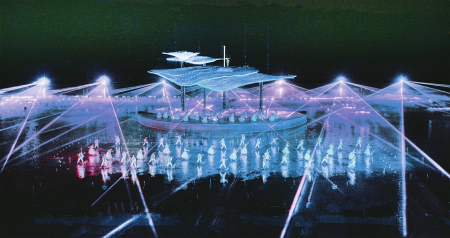 在這場演出中,最令人驚嘆的當(dāng)數(shù)傳統(tǒng)文化與現(xiàn)代科技的完美融合?!度鐗?mèng)晉陽》演出設(shè)備島造型由大量不銹鋼鋼管經(jīng)過設(shè)計(jì)、再加工拼接而成,整體形成“山”的造型,好似坐落于湖中心的小島。面積高達(dá)182米×82米的全水下噴泉矩陣、2000多束璀璨燈光,配合前方的直流、對(duì)拱、扇形水幕,連同后方80米×19米網(wǎng)幕形成的視覺矩陣投影,展現(xiàn)出宏大的山景古城畫面。這些畫面栩栩如生,將晉陽古城的歷史變遷、文化傳承一一展現(xiàn)在觀眾眼前,讓人仿佛置身于歷史的長河之中,親身感受著晉陽的興衰榮辱。
