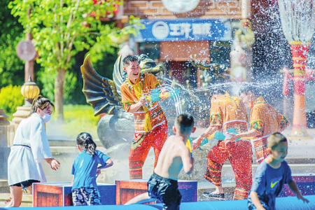 炎炎夏日,怎么能少了玩水的樂(lè)趣?活動(dòng)期間,樂(lè)園精心打造充滿(mǎn)濃郁“傣式”風(fēng)情的潑水活動(dòng)。身著傣族特色服飾的NPC們組成巡游隊(duì)伍,手持水盆、水槍?zhuān)c沿途游客熱情互動(dòng)?!按鋈ぴ炖藵娝髴?zhàn)”更是將歡樂(lè)氛圍推向高潮,游客們手持“武器”,展開(kāi)激烈的潑水對(duì)決。還有《昆侖探秘》《大禹治水》等水上游樂(lè)項(xiàng)目,讓游客盡享清涼,與夏天的快樂(lè)撞個(gè)滿(mǎn)懷!