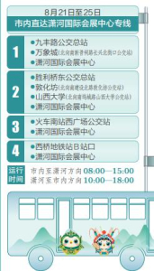 太原市將在山西文博會期間開通5條免費公交接駁專線。其中,4條市內直達瀟河國際會展中心的專線,分別從九豐路公交總站—萬象城(北向南新晉祠路長興北街口公交站)—瀟河國際會展中心;勝利橋東公交總站—敦化坊(北向南建設北路敦化坊公交站)—山西大學(北向南塢城路山西大學公交站)—瀟河國際會展中心;火車南站西廣場公交站—瀟河國際會展中心;西橋地鐵站B站口—瀟河國際會展中心。運行時間為市內至瀟河方向8:00—15:00,瀟河至市內方向10:00—18:00。此外,為便于駕車自行前往的市民出行,還開通了1條社會停車場至山西瀟河國際會展中心的免費接駁線路。該線路從先行路瀟河大街口經先行路至會展中心往返運行,在智慧南街口、先行路樂商街口停靠,運行時間為9:00—18:00。