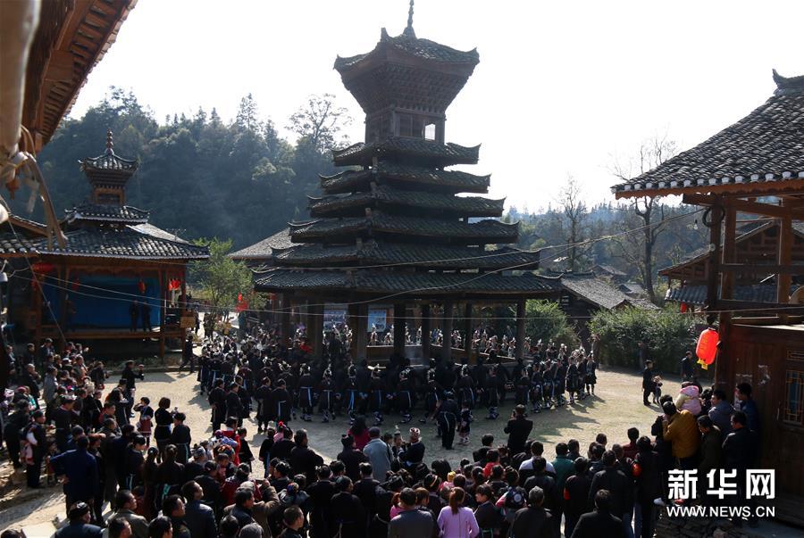 2月17日,貴州省黔東南苗族侗族自治州黎平縣巖洞鎮(zhèn)述洞村開(kāi)展一年一度的“鼓樓之宗”活動(dòng)。侗族老人在當(dāng)?shù)刈罟爬系墓臉恰冀ㄓ诿鞔莫?dú)柱鼓樓講述侗族遷徙歷程,告誡大家要敬老尊賢、和睦相處、團(tuán)結(jié)友善,侗族青年男女身著節(jié)日盛裝圍著鼓樓一邊踩歌堂,一邊唱遷徙古歌,之后在鼓樓旁進(jìn)行“侗族大歌”對(duì)唱,感懷族群遷徙的歷史,傳承傳統(tǒng)文化。新華社發(fā)(楊代富 攝)