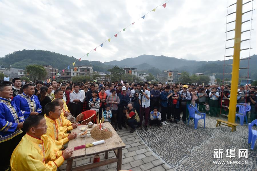 農(nóng)歷十月十五前后,福建西部武平縣各山村陸續(xù)進(jìn)入農(nóng)閑時(shí)節(jié)。按照當(dāng)?shù)仫L(fēng)俗,不同村子各自擇日舉辦民間活動(dòng),其中較有代表性的就是“上刀山”絕技?!吧系渡健苯^技在閩西山村流傳已有數(shù)百年歷史,表演者需光腳順著磨得鋒利閃亮的36把鋼刀,攀登至8米高的杉木柱子頂部,接受長者祝福,祈求風(fēng)調(diào)雨順、五谷豐登。新華社記者 宋為偉 攝