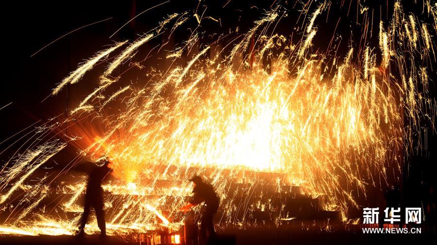 1月12日,河北磁縣開始舉行“打鐵花”慶新年活動?!按蜩F花”是以小煉鐵爐將生鐵化成鐵水后,用木板將鐵水加鋸末打上天空,鋸末在空中燃燒形成“鐵花火雨”四濺飛揚(yáng)的景象。打鐵花”是當(dāng)?shù)貧v史悠久的民俗娛樂活動。新華社發(fā) (趙鴻宇 攝)