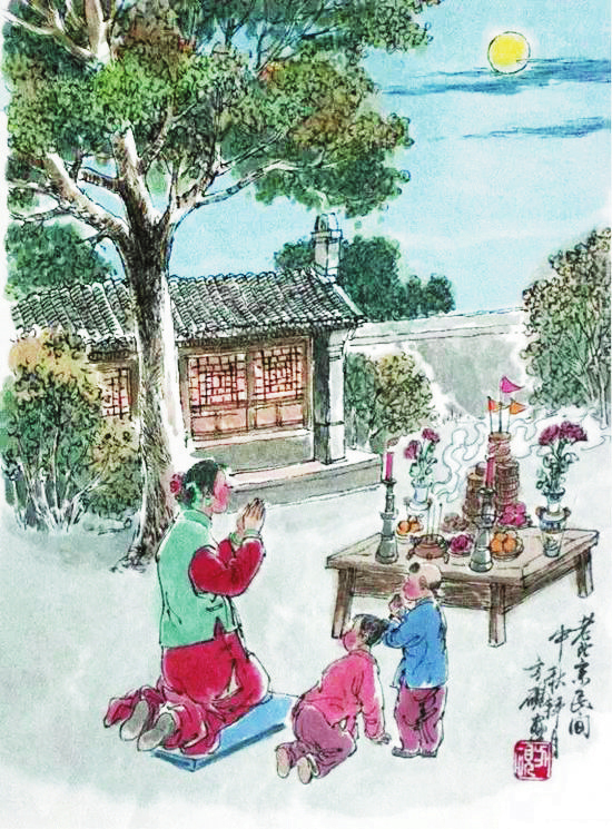 “中秋月。月到中秋偏皎潔?!辟p月是中秋節(jié)的重要習(xí)俗,我國(guó)民間的中秋賞月活動(dòng)約始于魏晉時(shí)期,盛于唐朝,當(dāng)時(shí)許多名篇佳作中都有詠月的詩(shī)句。北宋時(shí)期,以賞月活動(dòng)為中心的中秋節(jié)已成為普遍的民俗節(jié)日,然而與唐代不同的是,宋代關(guān)于賞月的作品多是感物傷懷,以陰晴圓缺喻人情世態(tài)。宋代的中秋夜是不眠之夜,夜市通宵營(yíng)業(yè),游人絡(luò)繹不絕,《東京夢(mèng)華錄》中載:“中秋節(jié)前,諸店皆賣新酒,貴家結(jié)飾臺(tái)榭,民家爭(zhēng)占酒樓玩月,笙歌遠(yuǎn)聞千里,嬉戲連坐至?xí)??!币恍┑胤缴踔亮鱾鳌爸星镆乖酵硭介L(zhǎng)壽”的說(shuō)法,于是有了守夜的習(xí)俗。守夜時(shí),家里長(zhǎng)輩通常會(huì)給小孩講關(guān)于月亮的故事,如嫦娥奔月、吳剛伐桂等,孩子們個(gè)個(gè)聽(tīng)得津津有味。