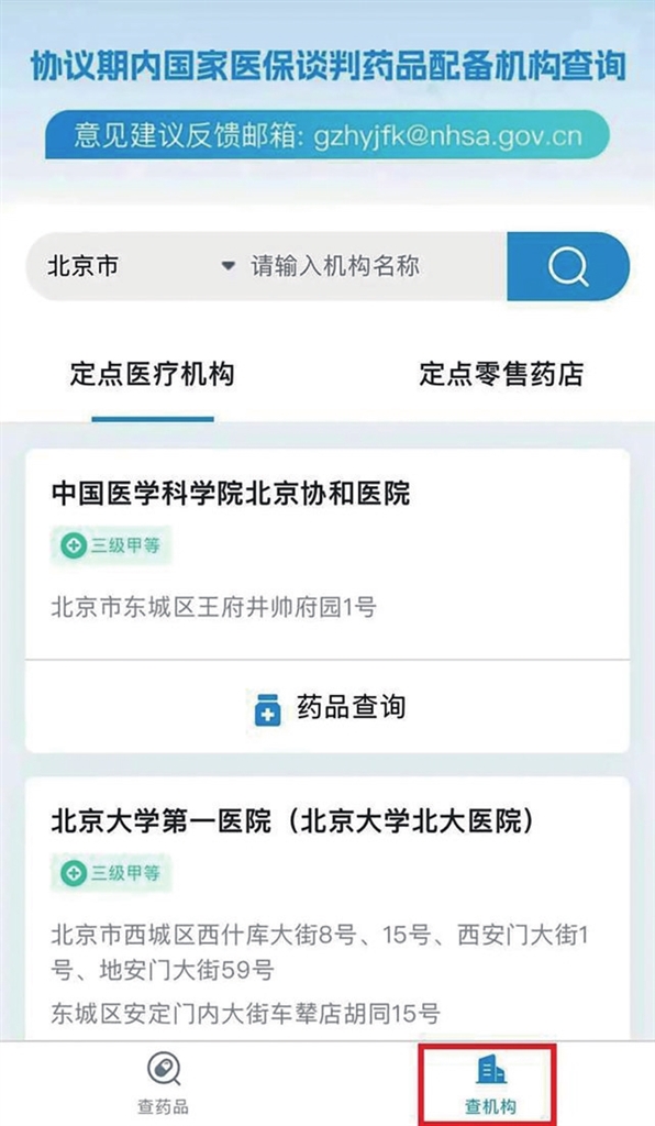 第三步:點(diǎn)擊“定點(diǎn)醫(yī)療機(jī)構(gòu)”或“定點(diǎn)零售藥店”,即可查詢?cè)撍幤吩诟鞯貐^(qū)的配備情況。同時(shí),您也可以點(diǎn)擊頁(yè)面下方“查機(jī)構(gòu)”,進(jìn)入“定點(diǎn)醫(yī)療機(jī)構(gòu)”或“定點(diǎn)零售藥店”頁(yè)面,確定具體的醫(yī)療機(jī)構(gòu)或零售藥店后,點(diǎn)擊“藥品查詢”,了解該機(jī)構(gòu)配備的全部“國(guó)談藥”情況。
