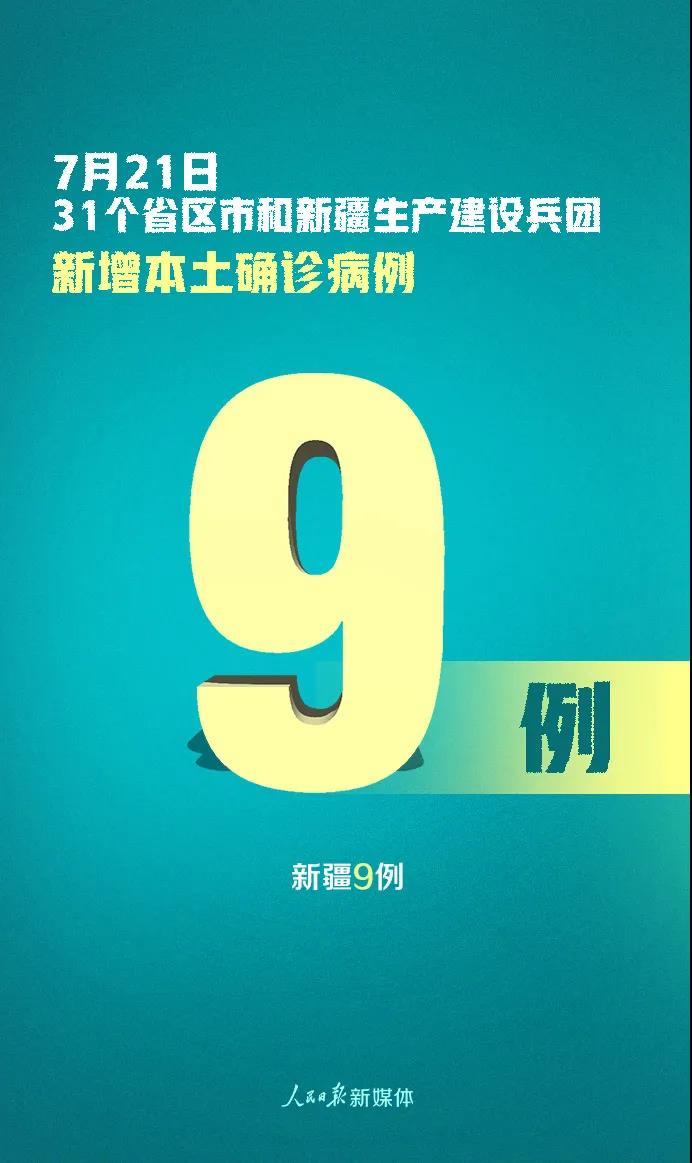 7月21日0—24時(shí),31個(gè)省(自治區(qū)、直轄市)和新疆生產(chǎn)建設(shè)兵團(tuán)報(bào)告新增確診病例14例,其中境外輸入病例5例(上海2例,廣東2例,云南1例),本土病例9例(均在新疆);無新增死亡病例;無新增疑似病例。
