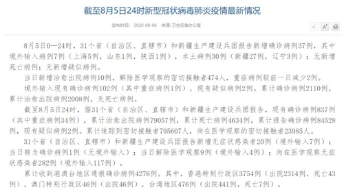 情況顯示,截至8月5日24時,據(jù)31個省(自治區(qū)、直轄市)和新疆生產(chǎn)建設(shè)兵團報告,現(xiàn)有確診病例837例(其中重癥病例34例),累計治愈出院病例79057例,累計死亡病例4634例,累計報告確診病例84528例,現(xiàn)有疑似病例2例。累計追蹤到密切接觸者795607人,尚在醫(yī)學(xué)觀察的密切接觸者23985人。