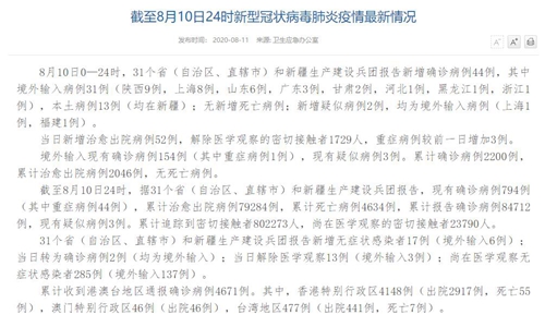 人民網(wǎng)北京8月11日電(董童)國(guó)家衛(wèi)生健康于今日在官網(wǎng)發(fā)布的《截至8月10日24時(shí)新型冠狀病毒肺炎疫情最新情況》(以下簡(jiǎn)稱“情況”)提出,8月10日0—24時(shí),31個(gè)?。ㄗ灾螀^(qū)、直轄市)和新疆生產(chǎn)建設(shè)兵團(tuán)報(bào)告新增確診病例44例,其中境外輸入病例31例(陜西9例,上海8例,山東6例,廣東3例,甘肅2例,河北1例,黑龍江1例,浙江1例),本土病例13例(均在新疆);無(wú)新增死亡病例;新增疑似病例2例,均為境外輸入病例(上海1例,福建1例)。當(dāng)日新增治愈出院病例52例,解除醫(yī)學(xué)觀察的密切接觸者1729人,重癥病例較前一日增加3例。