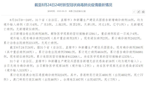 情況顯示,截至8月24日24時,據(jù)31個?。ㄗ灾螀^(qū)、直轄市)和新疆生產(chǎn)建設(shè)兵團報告,現(xiàn)有確診病例386例(其中重癥病例10例),累計治愈出院病例79961例,累計死亡病例4634例,累計報告確診病例84981例,現(xiàn)有疑似病例2例。累計追蹤到密切接觸者812268人,尚在醫(yī)學(xué)觀察的密切接觸者12370人。