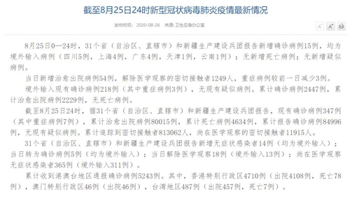 情況顯示,截至8月25日24時(shí),據(jù)31個(gè)?。ㄗ灾螀^(qū)、直轄市)和新疆生產(chǎn)建設(shè)兵團(tuán)報(bào)告,現(xiàn)有確診病例347例(其中重癥病例7例),累計(jì)治愈出院病例80015例,累計(jì)死亡病例4634例,累計(jì)報(bào)告確診病例84996例,無(wú)現(xiàn)有疑似病例。累計(jì)追蹤到密切接觸者813062人,尚在醫(yī)學(xué)觀察的密切接觸者11915人。