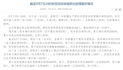 人民網(wǎng)北京9月8日電(董童)國(guó)家衛(wèi)生健康委于今日在官網(wǎng)發(fā)布的《截至9月7日24時(shí)新型冠狀病毒肺炎疫情最新情況》(以下簡(jiǎn)稱“情況)”提出,9月7日0—24時(shí),31個(gè)省(自治區(qū)、直轄市)和新疆生產(chǎn)建設(shè)兵團(tuán)報(bào)告新增確診病例10例,均為境外輸入病例(四川5例,廣東2例,天津1例,福建1例,陜西1例);無(wú)新增死亡病例;無(wú)新增疑似病例。當(dāng)日新增治愈出院病例15例,解除醫(yī)學(xué)觀察的密切接觸者336人,重癥病例與前一日持平。