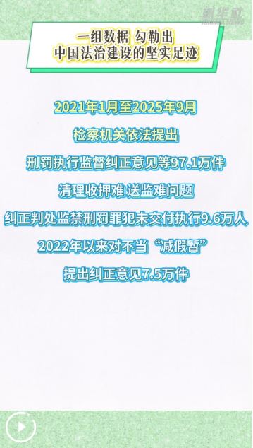 一組數(shù)據(jù),勾勒出中國法治建設的堅實足跡:2021年1月至2025年9月,檢察機關(guān)依法提出刑罰執(zhí)行監(jiān)督糾正意見等97.1萬件;清理收押難、送監(jiān)難問題,糾正判處監(jiān)禁刑罰罪犯未交付執(zhí)行9.6萬人;2022年以來對不當“減假暫”提出糾正意見7.5萬件……