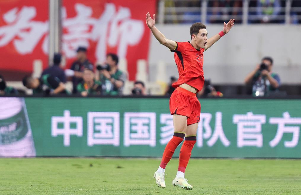 6月6日,首次代表國家隊(duì)出場(chǎng)的中國隊(duì)球員拜合拉木在進(jìn)球后慶祝。新華社記者 賈浩成 攝