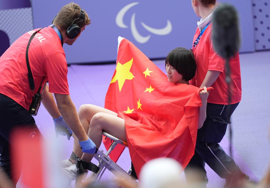 史逸婷在女子200米T36級決賽中拼到雙腿力竭,打破殘奧會紀(jì)錄奪冠。被攙上椅子后,她努力張開五星紅旗向全場展示。