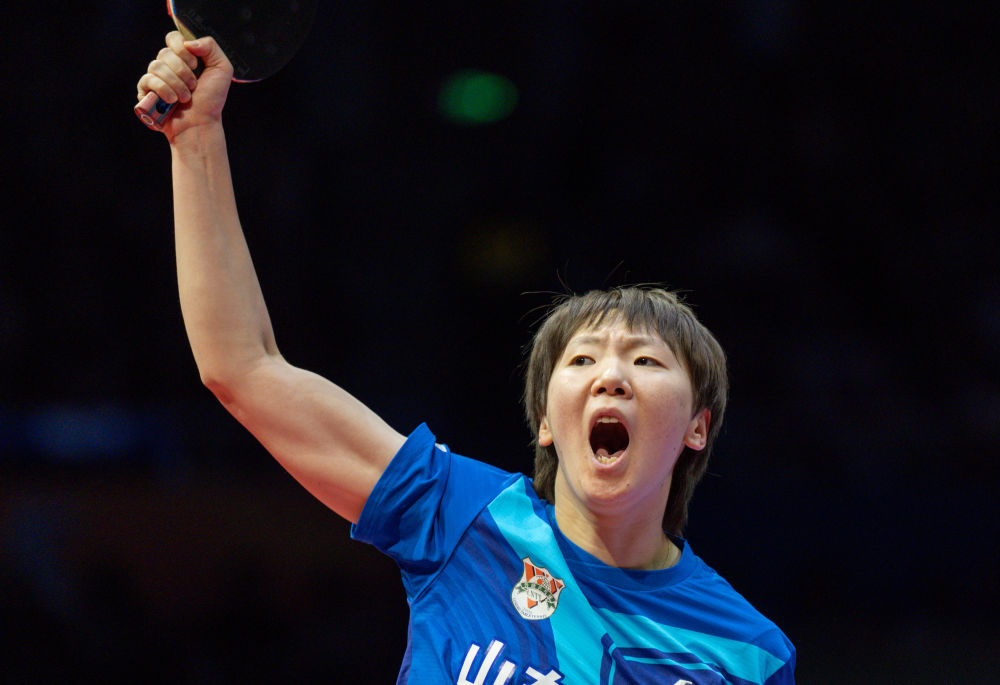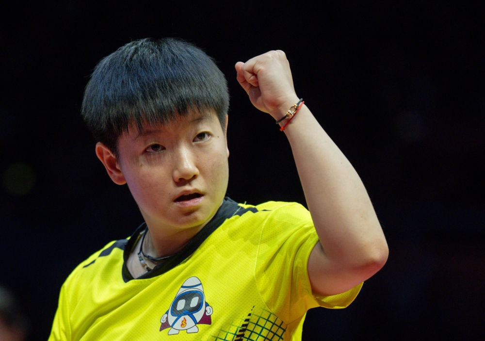 1月1日,深圳大學隊選手孫穎莎在單打比賽后慶祝勝利。新華社記者 孫非 攝
