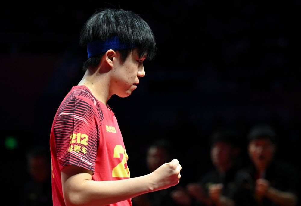 1月1日,山東魏橋·向尚運動隊選手王楚欽在單打比賽中慶祝。新華社發(fā)(陳浩明攝)