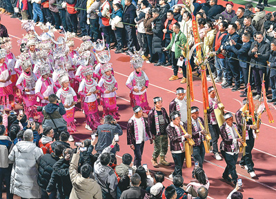 1月4日,發(fā)源于貴州省黔東南苗族侗族自治州榕江縣的“村超”正式拉開(kāi)第三屆賽事的序幕。圖為拉拉隊(duì)參加入場(chǎng)巡游。新華社記者 楊文斌攝