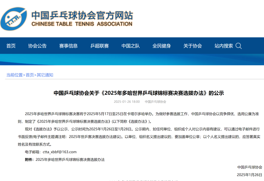| 中國乒協(xié)公示多哈世乒賽選拔辦法 |
