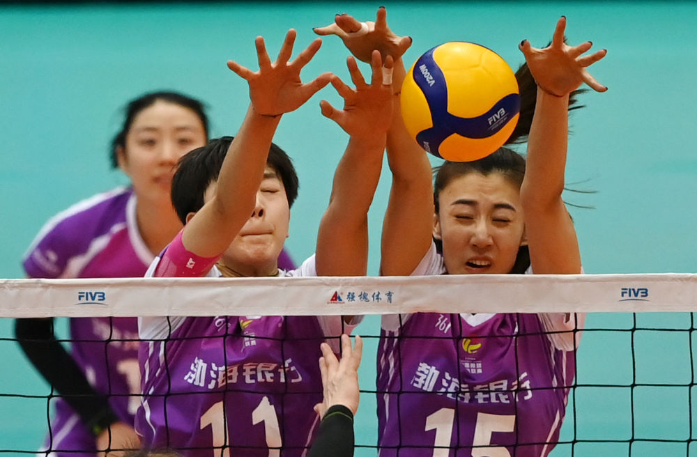 2月25日,天津隊(duì)球員陳博雅、王媛媛(右)在比賽中攔網(wǎng)。新華社記者 趙子碩 攝