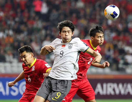 2月15日,中國隊球員劉誠宇(中)在比賽中爭頂。當日,在深圳舉行的2025亞足聯(lián)U20亞洲杯小組賽中,中國隊5:2戰(zhàn)勝吉爾吉斯斯坦隊。新華社記者 劉大偉 攝