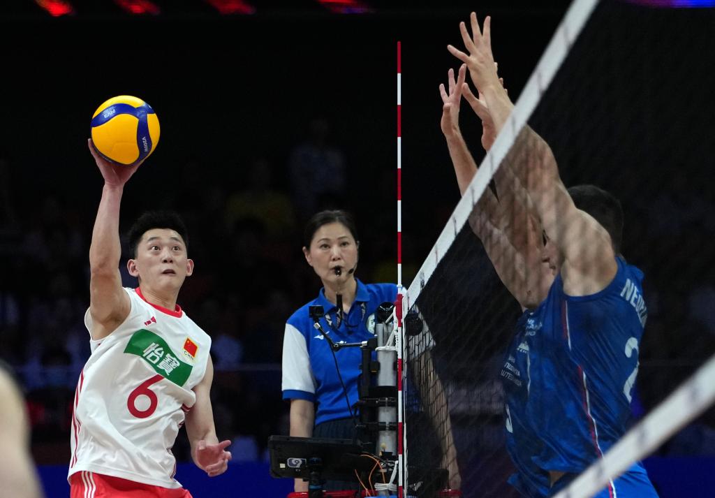 首局比賽,中國隊(duì)很快進(jìn)入狀態(tài),通過進(jìn)攻端的變化,有效破解了對手的網(wǎng)前防守,場面一度陷入膠著。雙方戰(zhàn)至23:23時(shí),俞元泰扣殺得分為中國隊(duì)迎來局點(diǎn),塞爾維亞隊(duì)隨后扣球出界,中國隊(duì)25:23先勝一局。