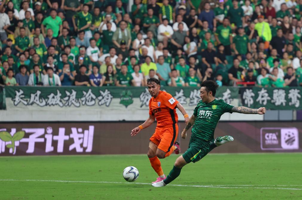 第38分鐘,老將王剛在右路突入禁區(qū)后勁射破門,幫助北京國安取得兩球領(lǐng)先。上半場補(bǔ)時階段,北京國安乘勝追擊,外援古加在禁區(qū)內(nèi)推射,再入一球。