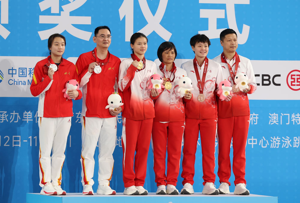 11月11日,獲得冠軍的廣東隊(duì)選手林珊(左三)、獲得亞軍的四川隊(duì)選手陳佳(左一)、獲得季軍的廣東隊(duì)選手陳藝文(右二)和她們的教練員在頒獎(jiǎng)儀式上合影。新華社記者 楊世堯 攝