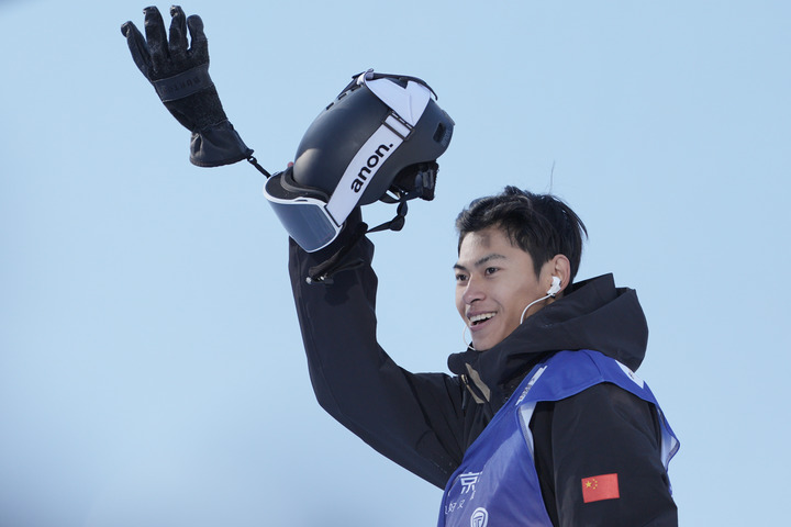 11月27日,中國(guó)單板滑雪運(yùn)動(dòng)員蘇翊鳴在資格賽晉級(jí)后慶祝。新華社記者 盧星吉 攝