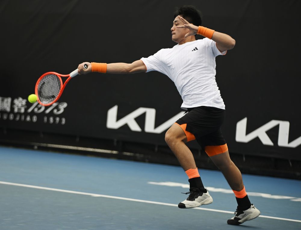 1月13日,吳易昺在比賽中回球。當日,在澳大利亞墨爾本進行的2026年澳大利亞網球公開賽男子單打資格賽首輪比賽中,中國選手吳易昺2:0戰(zhàn)勝美國選手克魯格,晉級資格賽第二輪。新華社發(fā)(王申攝)