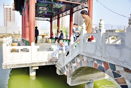 這個(gè)時(shí)候,宋利峰和女友劉丹,帶著姐姐的孩子也恰好走進(jìn)水榭。孩子們?cè)谂d趣方面往往會(huì)有驚人的趨同感,宋利峰的小外甥“眼饞”月月手里的魚食,在韓建萍的開(kāi)導(dǎo)下月月從袋子里抓了一把魚食給了這個(gè)陌生的小伙伴。月月仍在水榭西側(cè)的欄桿處向水面撒食,宋利峰的小外甥在石拱橋上模仿月月的動(dòng)作,兩個(gè)孩子之間的斜線距離不足一米。