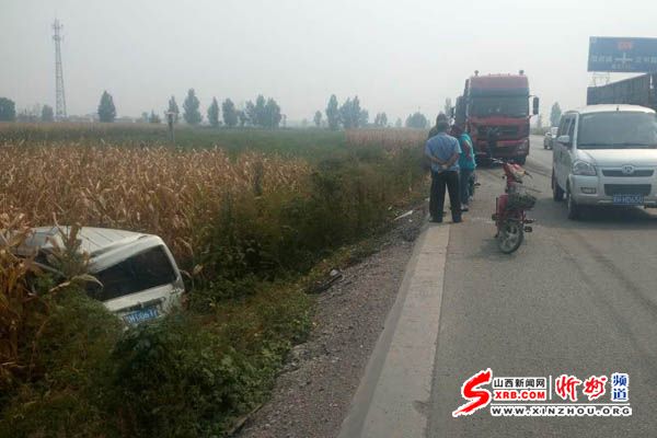 9月16日下午13時左右,在忻州東外環(huán)108國道北肖村段,一輛大貨車發(fā)生追尾,將路邊停放的面包車撞到了溝里,所幸車內(nèi)無人,未造成人員傷亡。(韓偉)