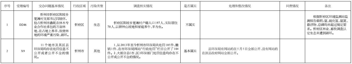 2017年5月2日晚,收到省群眾反映問(wèn)題處置組督辦的第四批群眾反映問(wèn)題共計(jì)2件。其中重點(diǎn)案件1件。我市高度重視,立即組織查處,截至5月5日,督辦的2件群眾反映問(wèn)題已辦結(jié)。其中,確認(rèn)基本屬實(shí)1件、不屬實(shí)1件。對(duì)于環(huán)保部門存在處罰信息不公開(kāi)或者公開(kāi)不全的情況,各縣(市、區(qū))已于2017年5月5日前全部在政府網(wǎng)站或環(huán)保部門網(wǎng)站進(jìn)行了公開(kāi);對(duì)2件群眾反應(yīng)問(wèn)題調(diào)查處理情況進(jìn)行了信息公開(kāi)。
