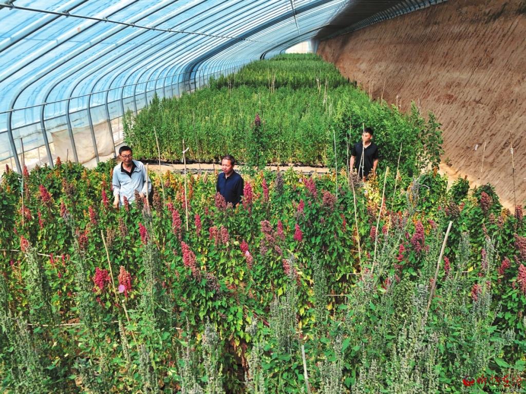 技術(shù)人員在藜麥育種試驗(yàn)棚內(nèi)觀察植株生長(zhǎng)情況。記者 宮愛(ài)文攝