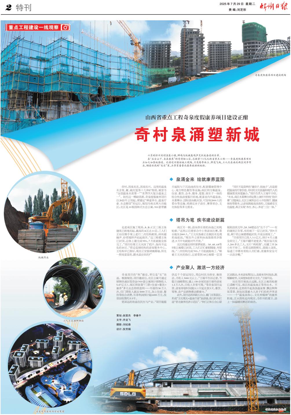 在“五臺(tái)山下、自在康養(yǎng)”的奇村核心區(qū),總投資7.5億元的省重點(diǎn)工程——奇泉度假康養(yǎng)項(xiàng)目正如火如荼地推進(jìn)。記者近日探訪施工現(xiàn)場(chǎng),只見(jiàn)塔吊林立、焊花飛濺,工人們?cè)谀媳眱蓞^(qū)同步作業(yè),鋼筋水泥的“生長(zhǎng)”里,正孕育著晉北康養(yǎng)旅游新地標(biāo)。