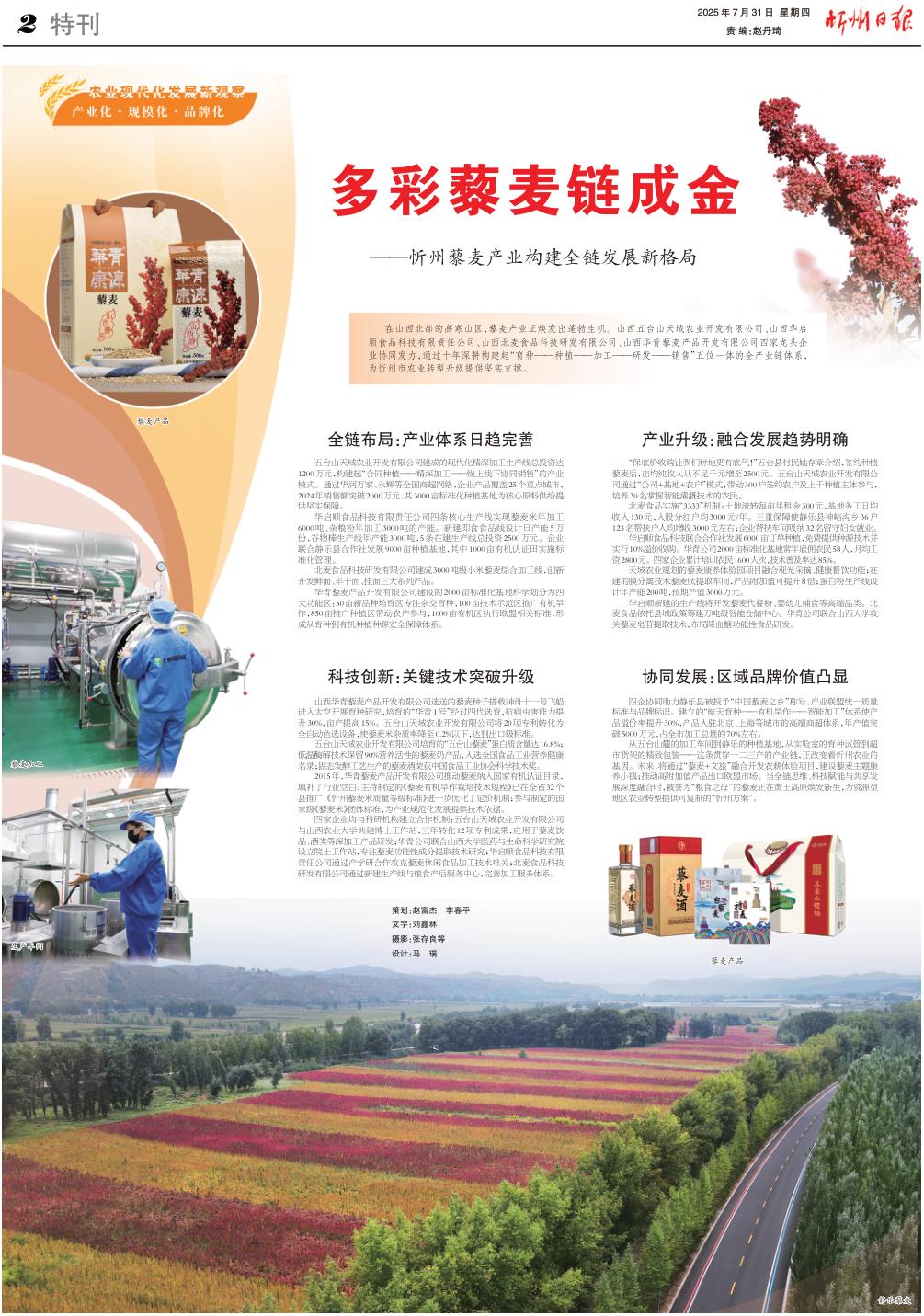 從五臺山麓的加工車間到靜樂的種植基地,從實(shí)驗(yàn)室的育種試管到超市貨架的精致包裝——這條貫穿一二三產(chǎn)的產(chǎn)業(yè)鏈,正改變著忻州農(nóng)業(yè)的基因。未來,將通過“藜麥+文旅”融合開發(fā)農(nóng)耕體驗(yàn)項(xiàng)目,建設(shè)藜麥主題康養(yǎng)小鎮(zhèn);推動高附加值產(chǎn)品出口歐盟市場。當(dāng)全鏈思維、科技賦能與共享發(fā)展深度融合時(shí),被譽(yù)為“糧食之母”的藜麥正在黃土高原煥發(fā)新生,為資源型地區(qū)農(nóng)業(yè)轉(zhuǎn)型提供可復(fù)制的“忻州方案”。