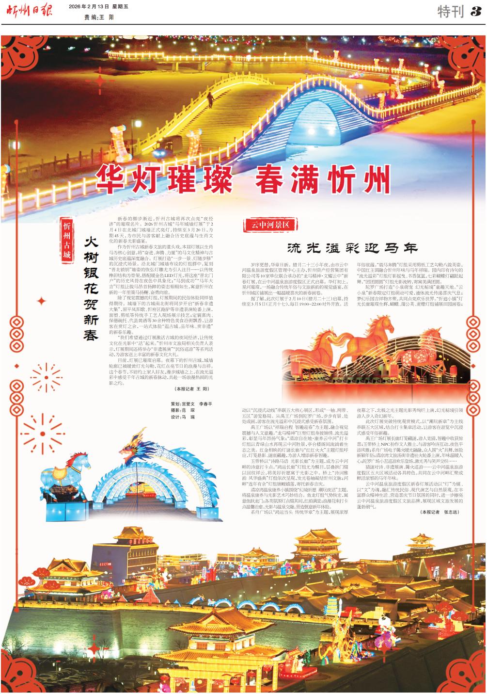 新春的腳步漸近,忻州古城將再次點(diǎn)亮“夜經(jīng)濟(jì)”的璀璨名片。2026忻州古城“馬年城墻燈展”于2月4日在北城門(mén)城墻正式亮燈,持續(xù)至3月20日,為期45天,為市民與游客獻(xiàn)上融合歷史底蘊(yùn)與生肖文化的新春光影盛宴。
