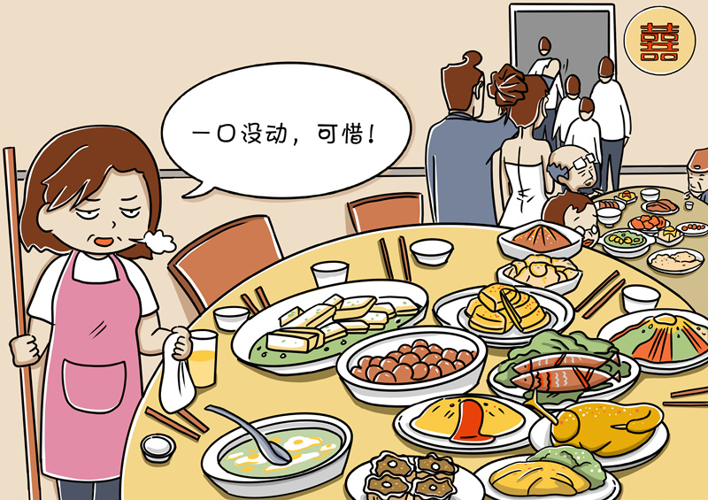 杜絕“剩宴”需要社會(huì)合力。結(jié)婚“剩宴”并不是短時(shí)間形成的,也不是個(gè)別現(xiàn)象,因此,根治這種陋習(xí)、在全社會(huì)培養(yǎng)節(jié)約意識(shí)和節(jié)儉習(xí)慣是一項(xiàng)長期任務(wù),也是一項(xiàng)全民行動(dòng),需要社會(huì)各界多元化、多角度共同推進(jìn)。比如,黨員干部以身作則,率先垂范;餐飲行業(yè)增強(qiáng)節(jié)約意識(shí),改進(jìn)服務(wù),合理優(yōu)化供應(yīng)標(biāo)準(zhǔn)。只有人人轉(zhuǎn)變觀念,共同做厲行節(jié)約、反對(duì)浪費(fèi)的踐行者、宣傳者和監(jiān)督者,才能帶動(dòng)形成良好社會(huì)風(fēng)氣。(文字:馬若虎 漫畫:甘甜)
