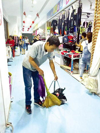整個云河商場只有一層,共60多家商戶,衛(wèi)生清潔一天3次,工作量雖然不是很大,卻也不輕松。記者見到老馬時,他正在做商場關門前的最后一次清掃。不時有商戶喊老馬過去收紙箱和塑料袋,老馬加快了手里的動作?!吧虉鍪枪矆鏊芾硪餐栏竦?,我得隨時注意看哪里有了垃圾,或是公共設施出了問題,要不人來人往怕出事。干凈整潔的環(huán)境代表著商場的形象,也能讓顧客購物時有個好心情,這也是我工作的價值吧?!崩像R坦言,有的人衛(wèi)生習慣特別不好。商場里童裝生意最為火爆,有個別帶孩子的家長直接讓孩子隨地大小便,不僅弄臟了環(huán)境也作了不良示范。老馬希望通過創(chuàng)衛(wèi),大家愛護環(huán)境衛(wèi)生的意識得到提高,這樣他也可以輕松點了。(王菲)