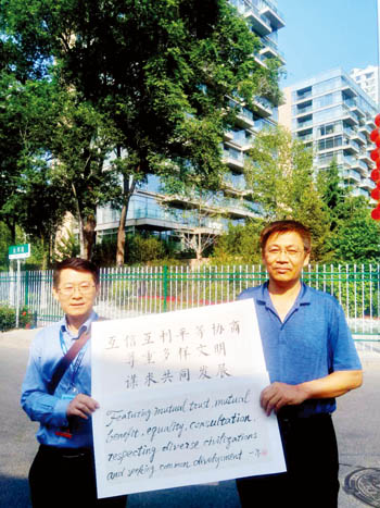作品由兩件組成,均由宣紙裝裱,尺幅90×60,內(nèi)容體現(xiàn)的是“上海精神”。一件由一爾分作三行,用毛筆大楷書寫,內(nèi)容是“互信互利平等協(xié)商,尊重多樣文明,謀求共同發(fā)展”,另一件為對(duì)應(yīng)的意譯毛筆英語(yǔ),分四行完成。