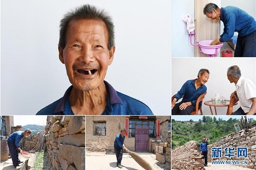 魏連保,男,1949年出生,山西省長(zhǎng)治市沁源縣支角村人。獨(dú)居的他生活不便,2017年年底,村委會(huì)為魏連保在內(nèi)的8位老人修建了一排整齊的新居,并統(tǒng)一安排就餐。 左上:魏連保肖像;右上:魏連保在新居洗臉;右中:魏連保(左)在新居和鄰居李秀成聊天;下右:魏連保在舊居前留影;下中:魏連保在舊居打掃院子;下左:魏連保在舊居為蔬菜澆水(拼版照片,6月18日攝)。 地處晉東南的山西省長(zhǎng)治市,位于由太行山、太岳山環(huán)繞而成的上黨盆地中。在群山中、崖壁上,許多村莊自然條件惡劣,基礎(chǔ)設(shè)施落后,脫貧致富是大山深處人們的迫切心愿。 近年來(lái),一場(chǎng)場(chǎng)脫貧攻堅(jiān)戰(zhàn),在一個(gè)個(gè)深山村打響。政府全力探索脫貧路徑的同時(shí),山區(qū)百姓因地制宜,靠自己的雙手和智慧走上致富路,交出了一份扎實(shí)的脫貧答卷。 記者在太行山、太岳山一路尋訪,記錄下多位70歲老人的生活。這些共和國(guó)的同齡人,親歷了山鄉(xiāng)的巨變,見(jiàn)證著長(zhǎng)治山區(qū)脫貧攻堅(jiān)偉大工程的一步步推進(jìn)。 新華社記者 楊晨光 攝