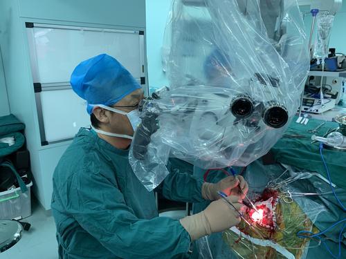 做顱底外科手術的時候,郭智霖經常要在直徑不到1毫米的血管吻合處懸腕縫合幾針、十幾針。他端坐在手術凳上,透過10倍手術顯微鏡,用比頭發(fā)絲還細的縫合針,在薄如蟬翼的血管壁上進針。有時,每進一針就要耗時一小時。此時,如果持針的手哪怕有一絲顫抖,都可能使患者致死或致殘。手術中,他必須連續(xù)幾小時、十幾小時保持一種體位。縫完最后一針的時候,四肢僵直,在助手攙扶下走下手術臺,半天也緩不過勁兒來。