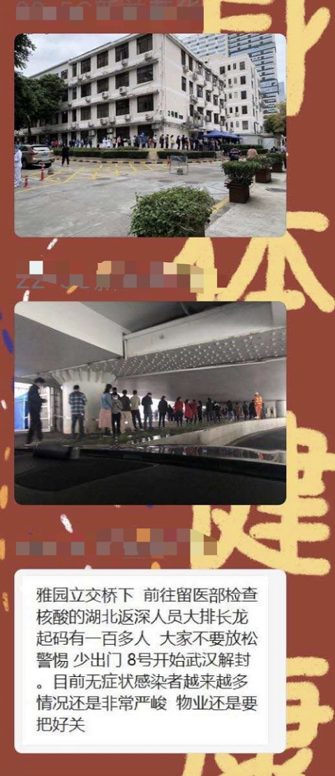 “雅園立交橋下,前往留醫(yī)部檢查核酸的湖北返深人員大排長(zhǎng)龍,起碼有一百人,大家不要放松警惕,少出門。”7日,這段文字和兩張大排長(zhǎng)龍的圖片在網(wǎng)上流傳。記者9日從深圳市人民醫(yī)院獲悉,該情況并不屬實(shí)。一份核酸取樣平均時(shí)間為數(shù)秒鐘,醫(yī)院核酸檢測(cè)排隊(duì)患者一般在10~50人之間,因?yàn)樾枰3?米隔離,隊(duì)伍會(huì)比較長(zhǎng),但也未超過百米,更不存在排出醫(yī)院大門外或雅園立交橋下,市民無需緊張。