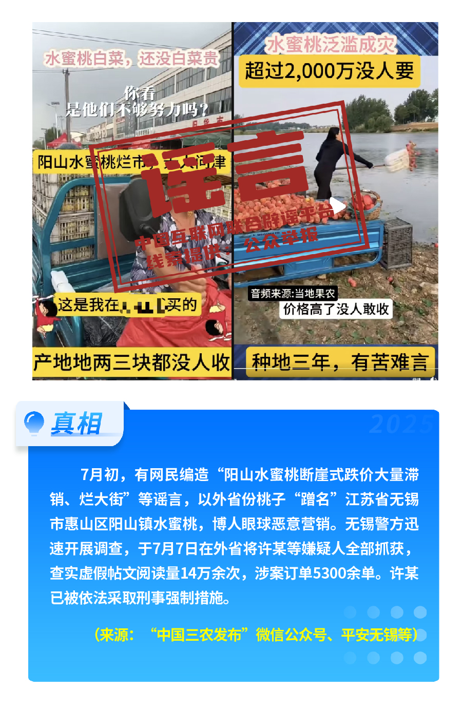 此外,7月份正值暑期旅游旺季和水果等農(nóng)產(chǎn)品收獲季,有自媒體、商家借機(jī)編造傳播涉文旅及農(nóng)產(chǎn)類謠言,干擾市場秩序,侵害消費者權(quán)益。有商家違規(guī)使用人民大會堂建筑圖片標(biāo)識和名稱,仿冒人民大會堂賬號,非法售賣、倒賣參觀門票,損害游客權(quán)益。個別商家剪輯發(fā)布“江蘇無錫陽山水蜜桃斷崖式跌價、大量滯銷、爛大街”謠言視頻,再借機(jī)兜售假冒的陽山水蜜桃,博人眼球惡意營銷,擾亂市場秩序。所謂“峨眉山人猴大戰(zhàn),游客墜崖,猴王被當(dāng)場擊斃”景區(qū)安全事件一度傳得沸沸揚揚,相關(guān)視頻以驚悚情節(jié)博取關(guān)注,畫面實際是用AI合成拼接制作。
