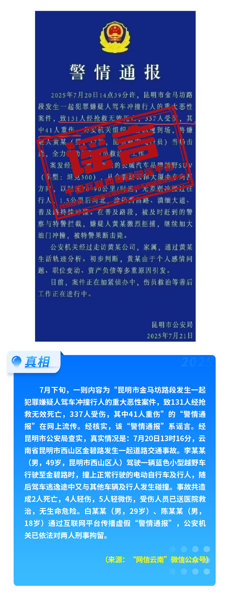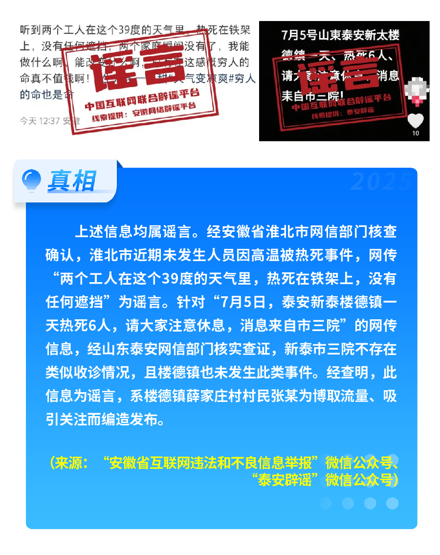 近期,網(wǎng)上接連出現(xiàn)發(fā)布虛假“警情通報”的惡性造謠傳謠案件,炮制傳播“昆明駕車撞人案131人死亡”“杭州自來水接入糞水”及涉釋永信虛假“警情通報”,模仿“藍(lán)底白字”格式,杜撰聳人聽聞細(xì)節(jié),損害政府公信力,嚴(yán)重擾亂社會秩序。“院士預(yù)測廣東將發(fā)生8級以上大地震”公然偽造專家聊天截圖,謊報地震預(yù)警。還有造謠者借盛夏高溫酷暑與洪澇災(zāi)害,編造“安徽淮北、山東泰安等地多人因高溫死亡” “重慶大暴雨導(dǎo)致15人死亡、4人失蹤”等謠言,蹭炒熱點、煽動情緒。