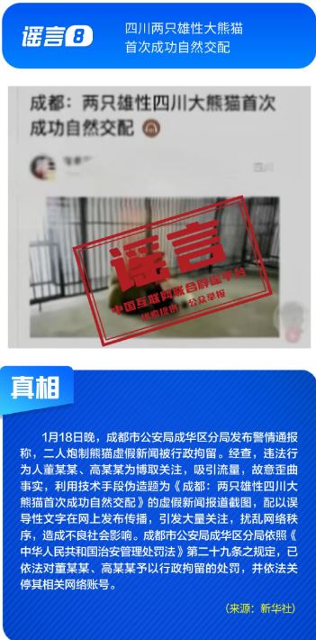 ??針對(duì)各類網(wǎng)絡(luò)謠言與亂象,多部門(mén)開(kāi)展協(xié)同治理,聯(lián)動(dòng)整治。1月16日,中央網(wǎng)信辦召開(kāi)全國(guó)網(wǎng)絡(luò)辟謠聯(lián)動(dòng)機(jī)制第三次全體會(huì)議,部署以辟謠工作新成效助力清朗網(wǎng)絡(luò)空間建設(shè)。中央網(wǎng)信辦聯(lián)合工業(yè)和信息化部等部門(mén)持續(xù)整治汽車行業(yè)網(wǎng)絡(luò)亂象,處置一批涉嫌挑動(dòng)對(duì)立、炒作負(fù)面話題、違規(guī)測(cè)評(píng)的賬號(hào);國(guó)家廣播電視總局開(kāi)展“AI魔改”視頻專項(xiàng)治理,各平臺(tái)處置大量違規(guī)內(nèi)容。各地網(wǎng)信部門(mén)積極行動(dòng),陜西西安深入開(kāi)展房地產(chǎn)領(lǐng)域網(wǎng)絡(luò)專項(xiàng)行動(dòng),處置散布樓市謠言的房產(chǎn)中介賬號(hào),四川成都依法處置30余個(gè)惡意關(guān)聯(lián)地域、污名化城市的違規(guī)賬號(hào)。公安機(jī)關(guān)依法打擊造謠傳謠人員。擺拍“小女孩在學(xué)校跳蚤市場(chǎng)用50元淘到名酒”、利用AI偽造“假救護(hù)車非法轉(zhuǎn)運(yùn)”、編造“兩只雄性四川大熊貓首次成功自然交配”等謠言的相關(guān)責(zé)任人已依法被予以行政處罰。