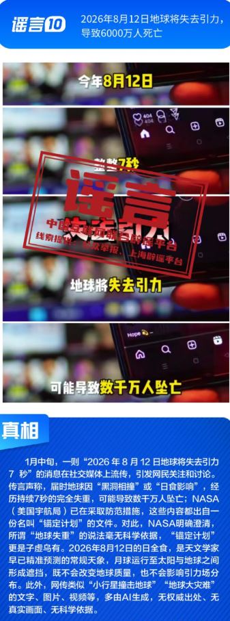 ??健康與科普領(lǐng)域謠言違背客觀規(guī)律?!叭搜椎鞍资恰黾用庖吡Α姆▽殹笨桃饪浯笤撎幏剿幍呐R床用途,忽略其特定醫(yī)療場(chǎng)景與使用風(fēng)險(xiǎn);所謂“大棚草莓、冷庫(kù)葡萄、進(jìn)口車?yán)遄?、染色砂糖橘是冬天水果界四大毒王”謠言片面解讀農(nóng)產(chǎn)品種植與保鮮方式,缺乏科學(xué)依據(jù);“四川兩只雄性大熊貓首次成功自然交配”純屬為吸引流量而捏造的獵奇內(nèi)容,其視頻畫(huà)面為AI生成;“2026年8月12日地球?qū)⑹ヒ?,?dǎo)致6000萬(wàn)人死亡”更是無(wú)中生有的荒謬謠言。