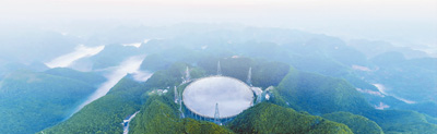 層巒疊嶂,翠林如海。在貴州省平塘縣的大山之間,一座恢弘大氣的單口徑球面射電望遠(yuǎn)鏡靜靜佇立,凝望星空,帶著人類的好奇和期待,探尋百億光年之外的射電信號。