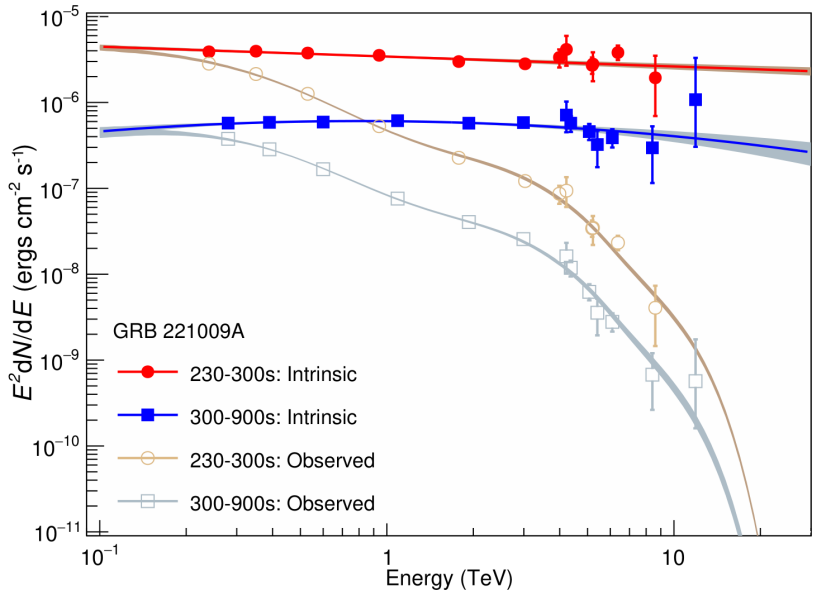 “拉索”測量的GRB 221009A在230-300秒和300-900秒兩段時間的伽馬射線能譜。(中國科學院高能物理研究所供圖)